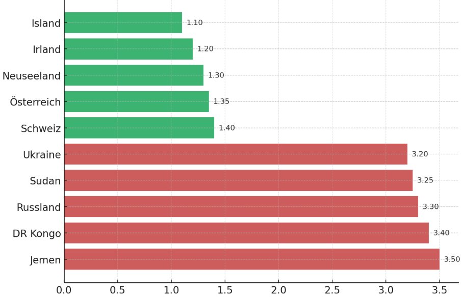 Aus diesen Daten entsteht ein Ranking – vom friedlichsten bis zum am wenigsten friedlichen Land.